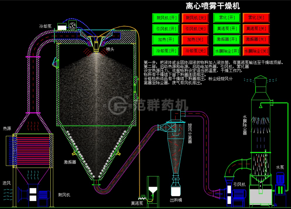 干燥機為開(kāi)式循環(huán),并流式,離心式霧化。干燥介質(zhì)空氣經(jīng)過(guò)初、中效空氣過(guò)濾器過(guò)濾后根據操作指令由鼓風(fēng)機吸取再經(jīng)加熱器加熱通過(guò)高效過(guò)濾器的熱風(fēng)分配器進(jìn)入噴霧干燥主塔。液體物料根據操作指令經(jīng)過(guò)蠕動(dòng)泵,進(jìn)入高速旋轉的離心噴頭,在離心力作用下被分散成小霧滴。在噴霧干燥主塔內,小霧滴與熱風(fēng)在充分接觸,沿其特定路徑進(jìn)行熱交換后被干燥成為產(chǎn)品,然后通過(guò)旋風(fēng)分離器實(shí)現分離,固體物料被收集,氣體介質(zhì)再經(jīng)過(guò)過(guò)濾后被排出。整套噴霧系統易清潔、無(wú)死角,符合GMP要求。