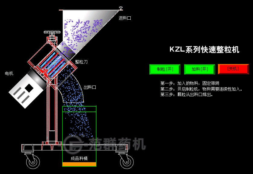 經(jīng)各種造粒工藝及設備所得到的顆粒形狀及規格各異。將造粒后的顆粒經(jīng)本機高速旋轉的刀片組切割后,經(jīng)網(wǎng)板排出,便可得到形狀及規格基本一致的顆粒。