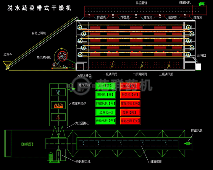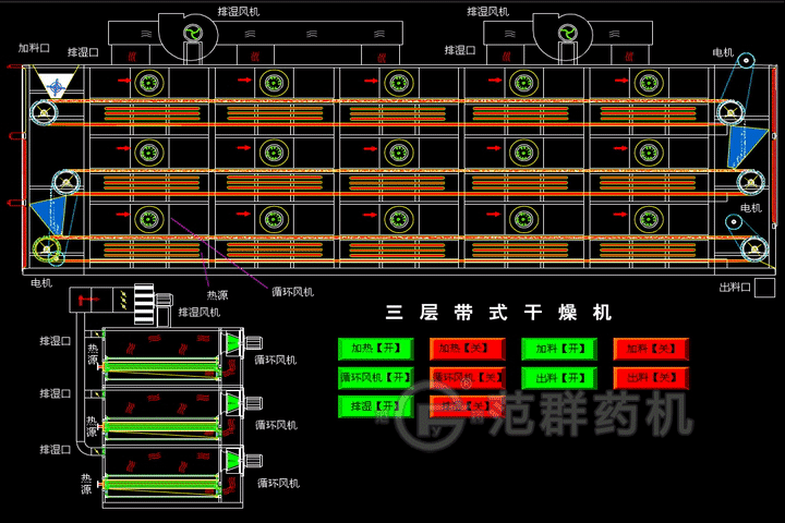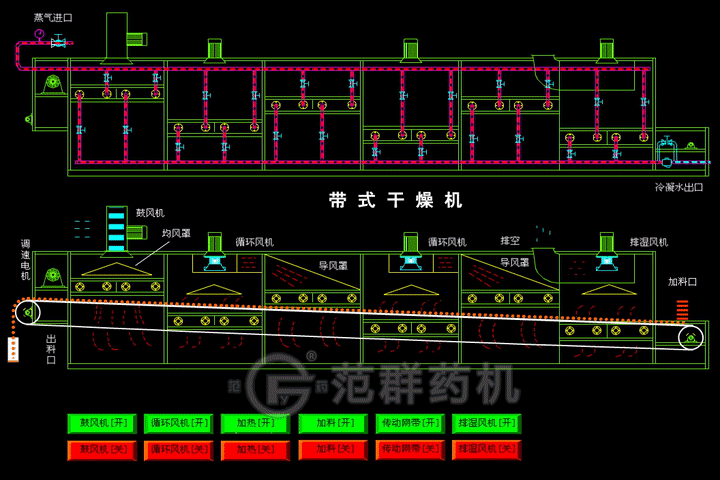 將所要處理的物料通過(guò)適當的加料機構(如星型布料器、擺動(dòng)帶、粉碎機或造粒機),分布在輸送帶上,輸送帶通過(guò)一個(gè)或幾個(gè)加熱單元組成的通道,每個(gè)加熱單元均配有空氣加熱和循環(huán)系統,每一個(gè)通道有一個(gè)或幾個(gè)排濕系統,在輸送帶通過(guò)時(shí),熱空氣從上往下或從下往上通過(guò)輸送帶上的物料,從而使物料能均勻干燥。