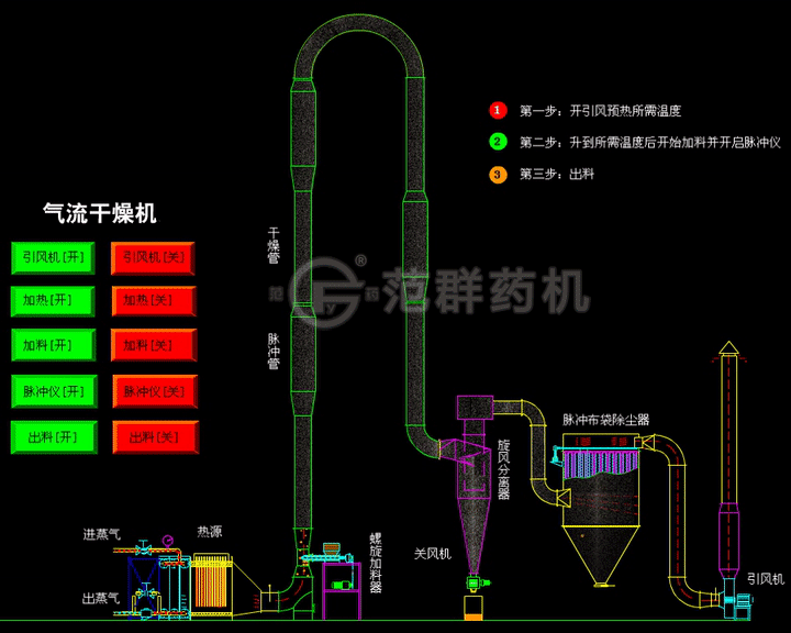 濕物料經(jīng)輸送機與加熱后的自然空氣同時(shí)進(jìn)入干燥器,二者充分混合,由于熱質(zhì)交換面積大,從而在很短的時(shí)間內達到蒸發(fā)干燥的目的。干燥后的成品從旋風(fēng)分離器排出,一小部分飛粉由旋風(fēng)除塵器或布袋除塵器得到回收利用。Q型氣流干燥器是負壓操作,物料不經(jīng)過(guò)風(fēng)機;QG型氣流干燥是正壓操作,物料經(jīng)過(guò)風(fēng)機帶有粉碎作用;FG型氣流干燥器是尾氣循環(huán)型;JG型氣流干燥是強化型氣流干燥器,其集閃蒸干燥與氣流干燥為一體,是我廠(chǎng)根據用戶(hù)要求設計的新型干燥設備。