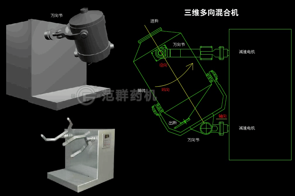 裝料的筒體在主動(dòng)軸的帶動(dòng)下,做周而復始的平移、轉動(dòng)和翻滾等復合運動(dòng),促使物料沿著(zhù)筒體作三向復合運動(dòng),從而實(shí)現多種物料的互相流動(dòng)、擴散、積聚、摻雜,以達到均勻混合的目的,避免了一般混合機因離心力作用所產(chǎn)生的物料比重偏析和積聚現象。