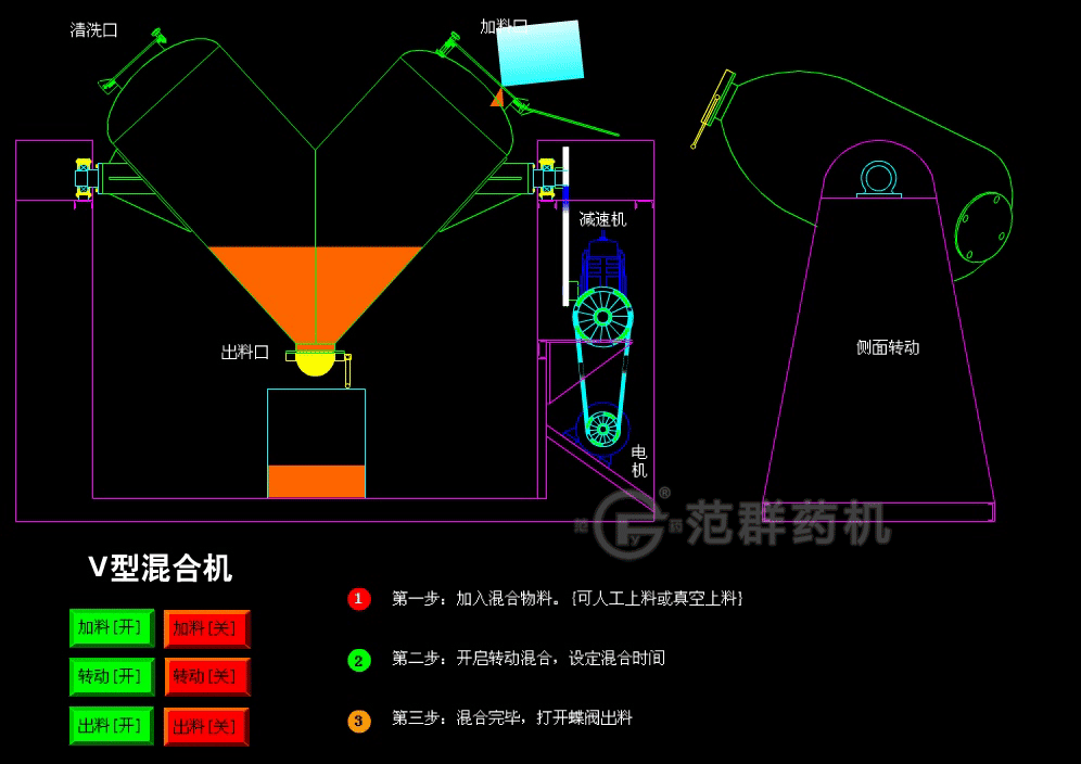 本機用于制藥、化工、食品等行業(yè)兩種以上的干粉狀、顆粒狀物料的混合。