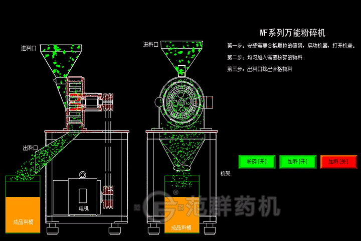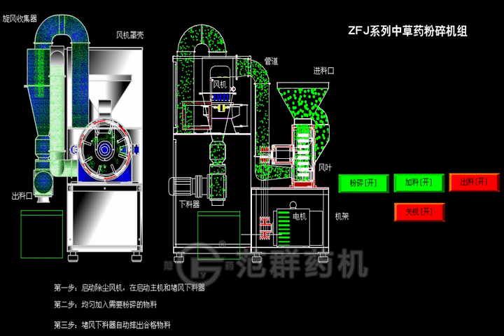 物料由料斗經(jīng)螺旋輸送器進(jìn)入粉碎室,粉碎物經(jīng)高速刀片剪切獲得粉碎,通過(guò)負壓風(fēng)運的方法把物料運入旋風(fēng)分離器,袋式除塵器、排出物料達到產(chǎn)品的要求。